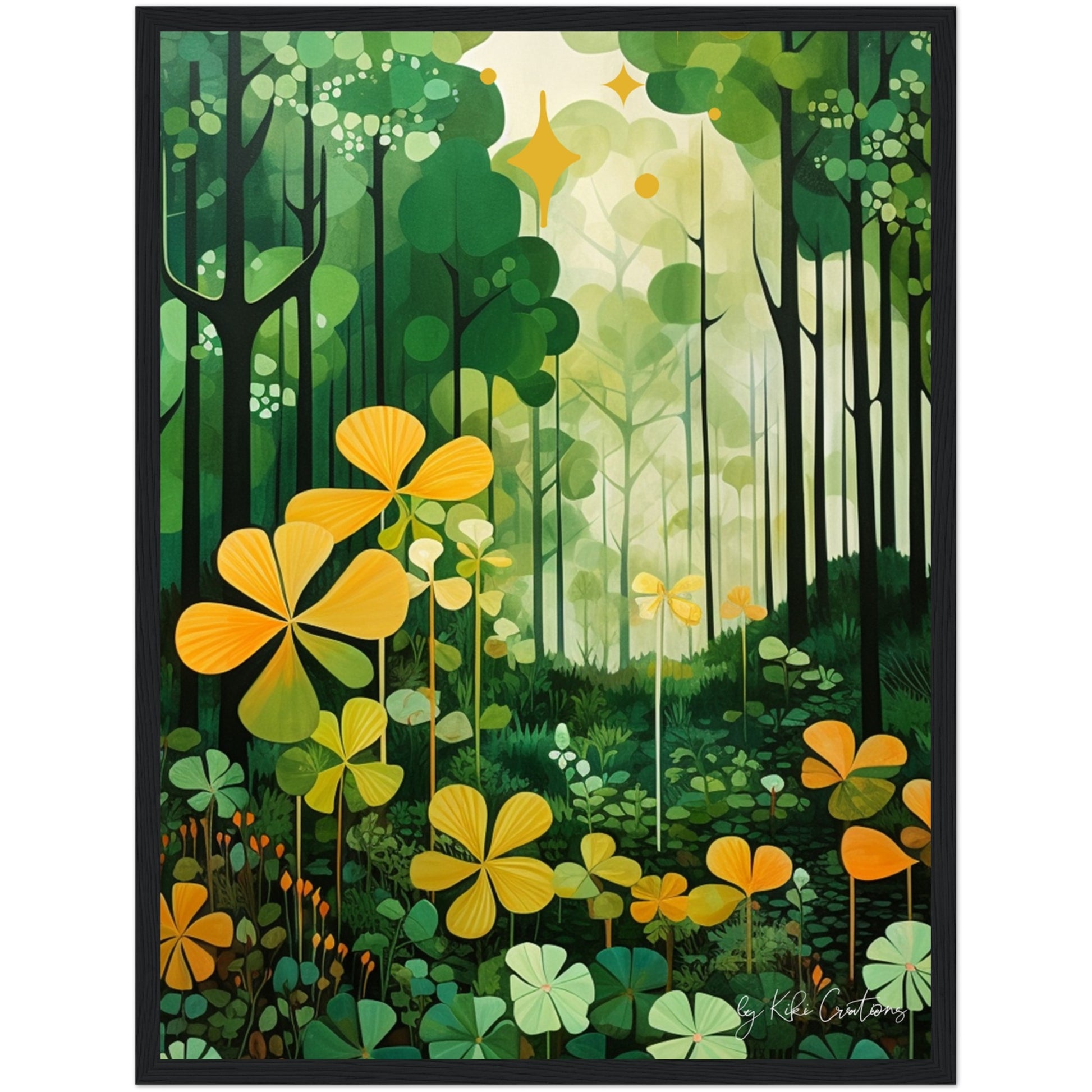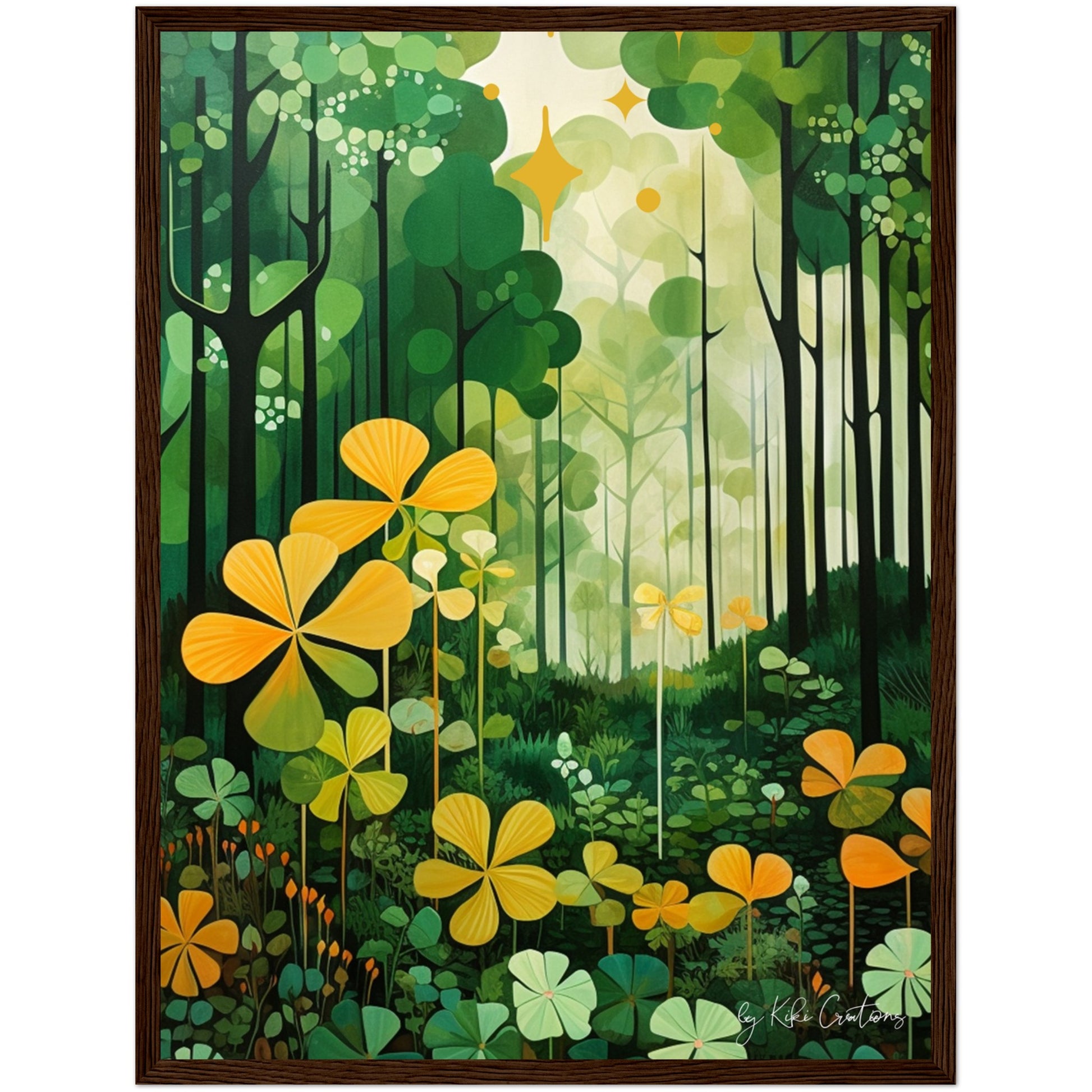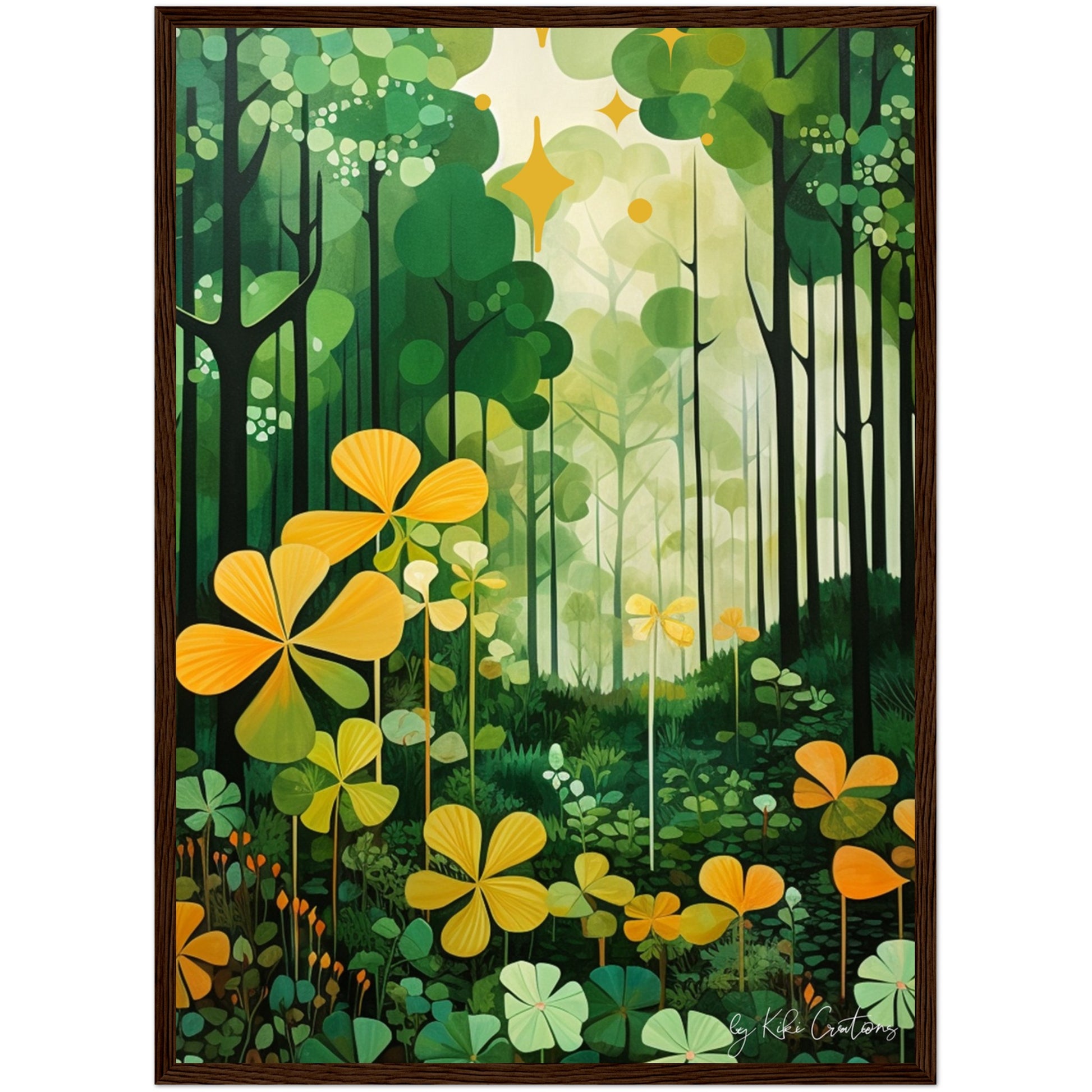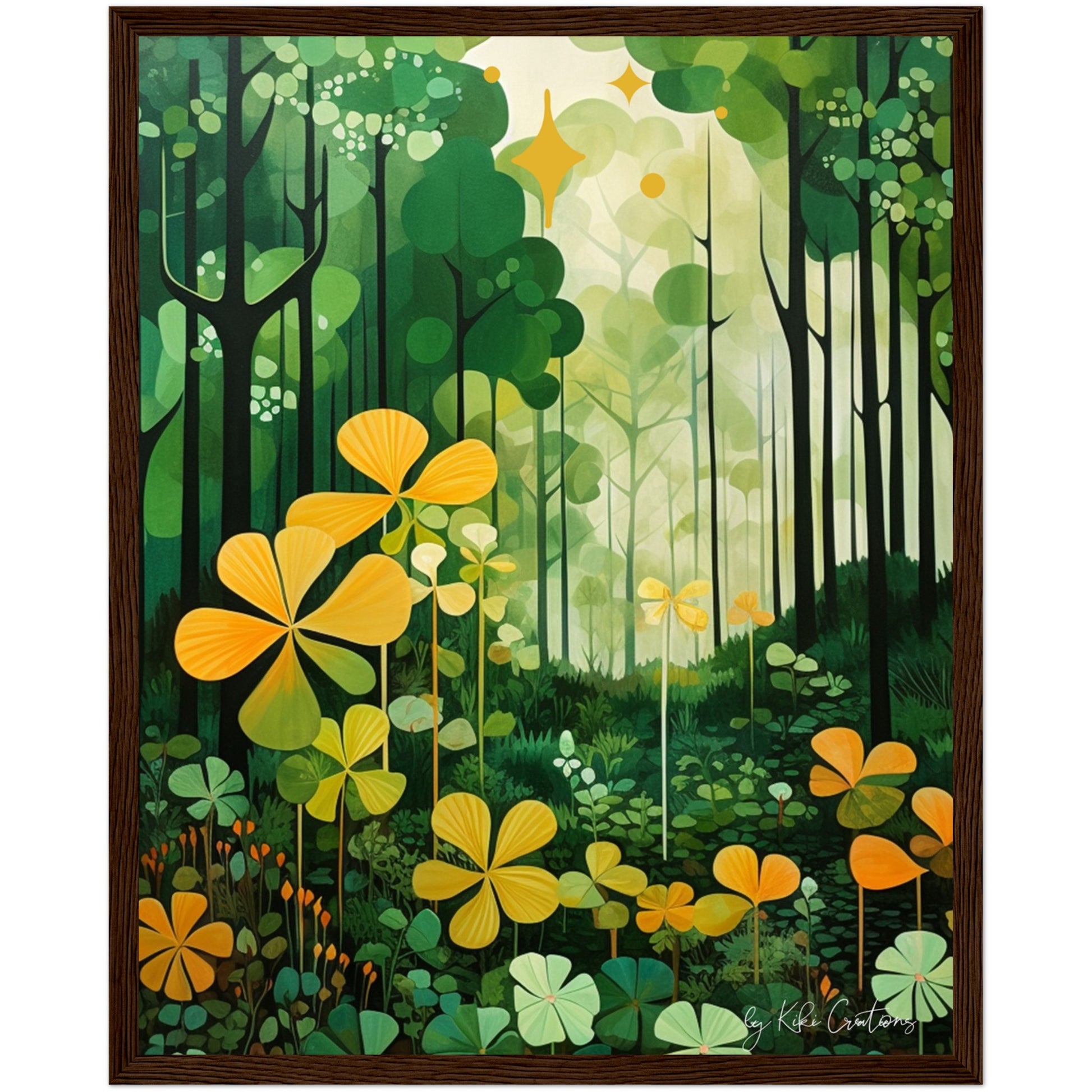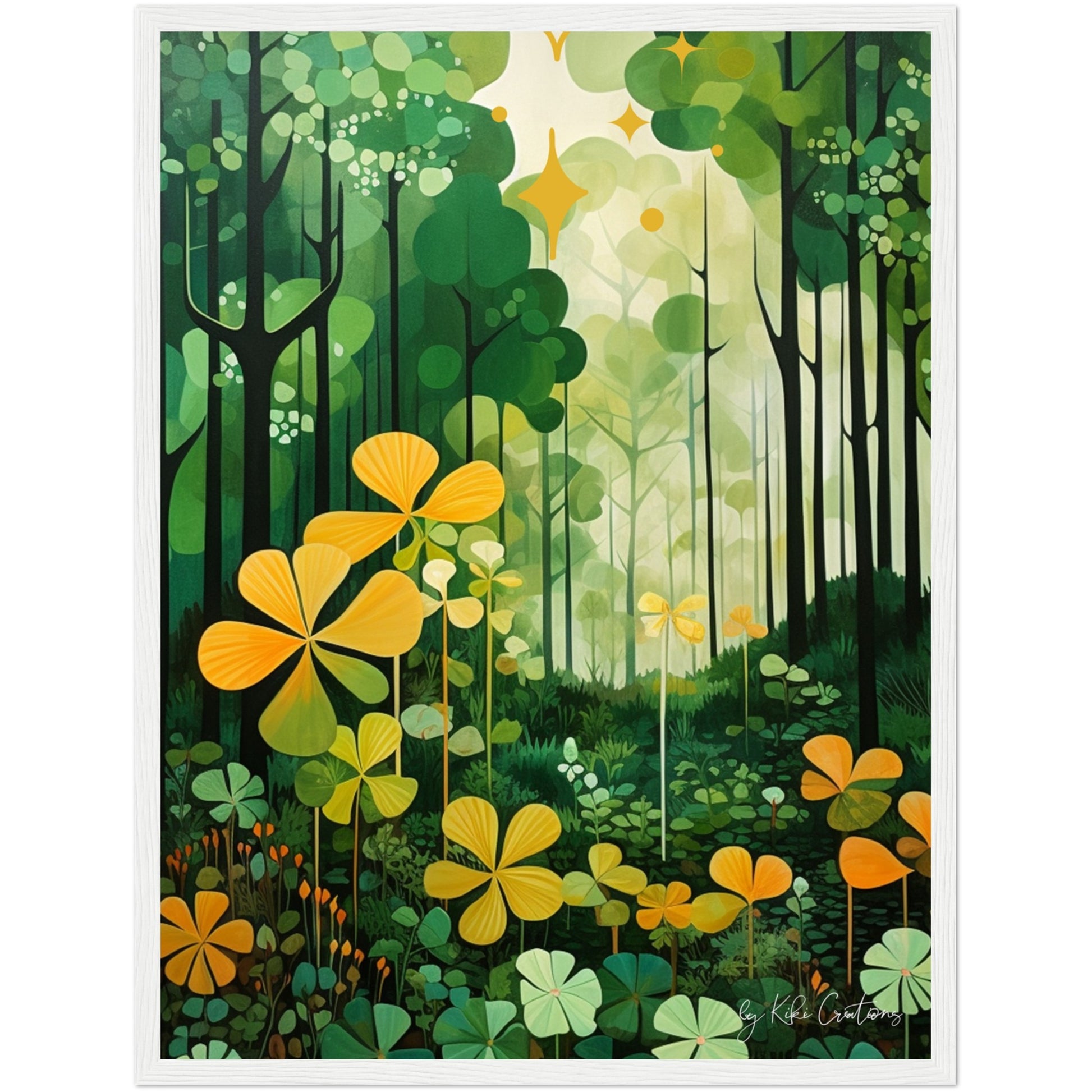 Shamrock Whispers: Enchanted Irish Forest: A mesmerizing abstract mid century art piece that immerses viewers in the heart of a lush and mystical Irish forest. The art piece is an ode to the captivating beauty and symbolism of Ireland, "the Emerald Isle", where nature reigns supreme, and the shamrock, a cherished national emblem, becomes an integral part of the landscape.