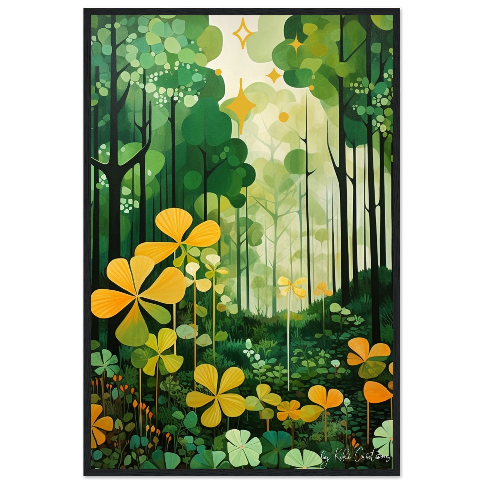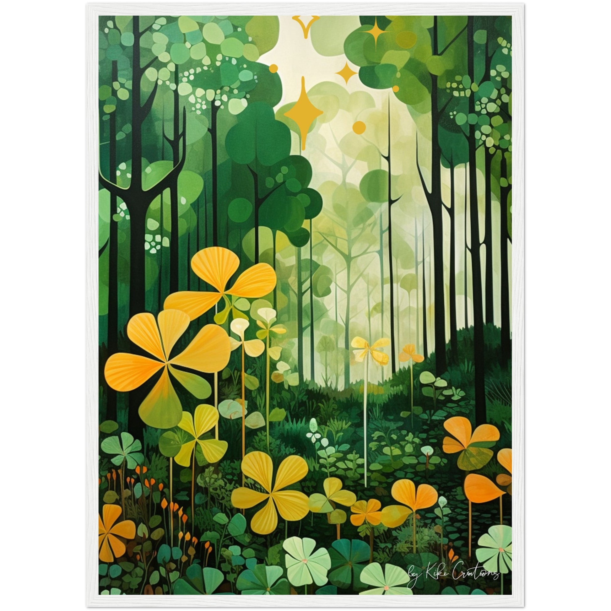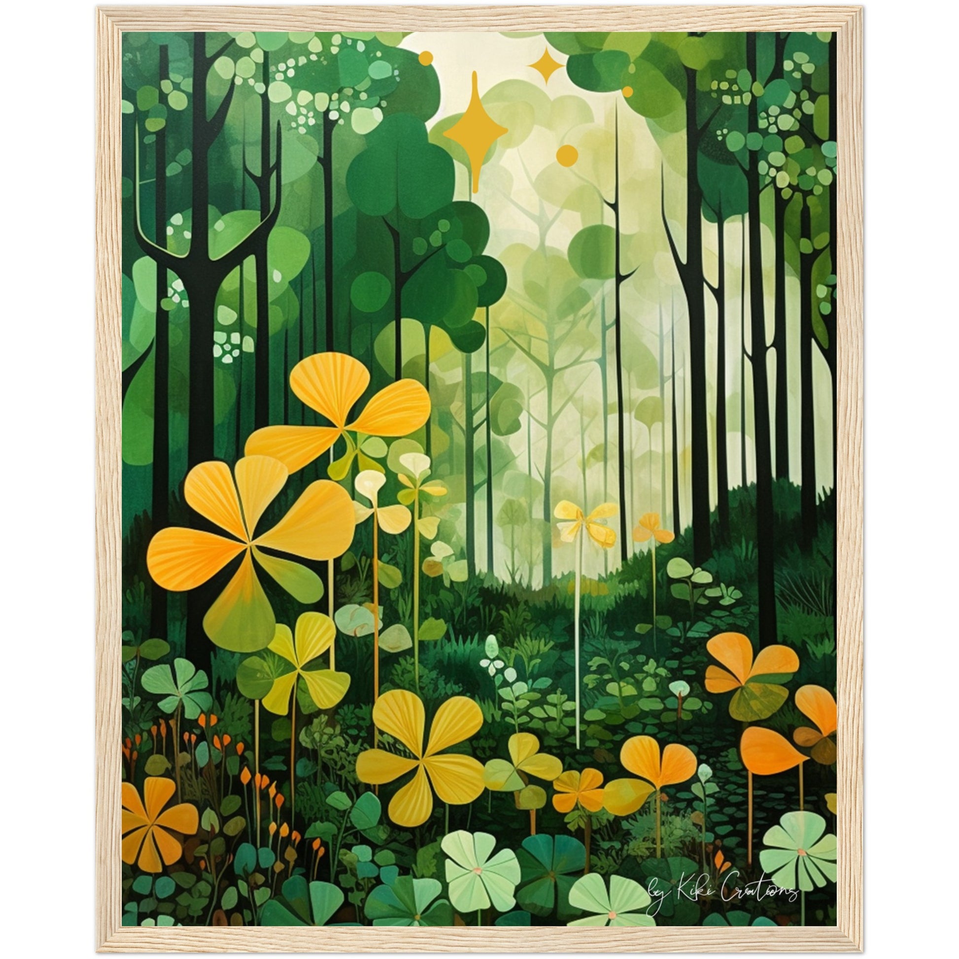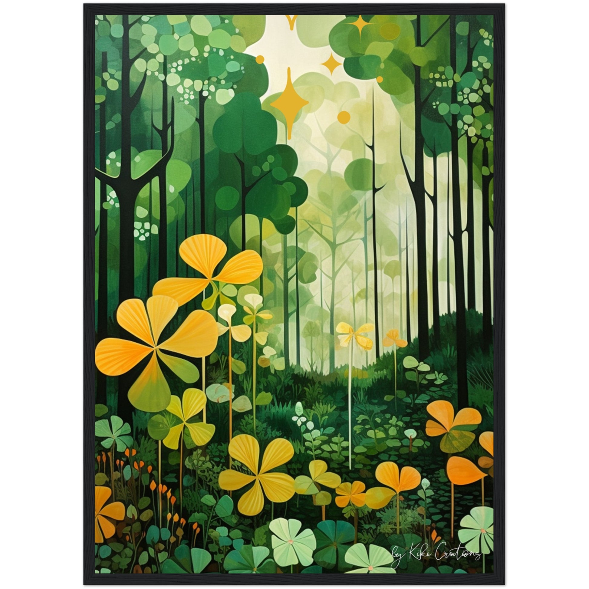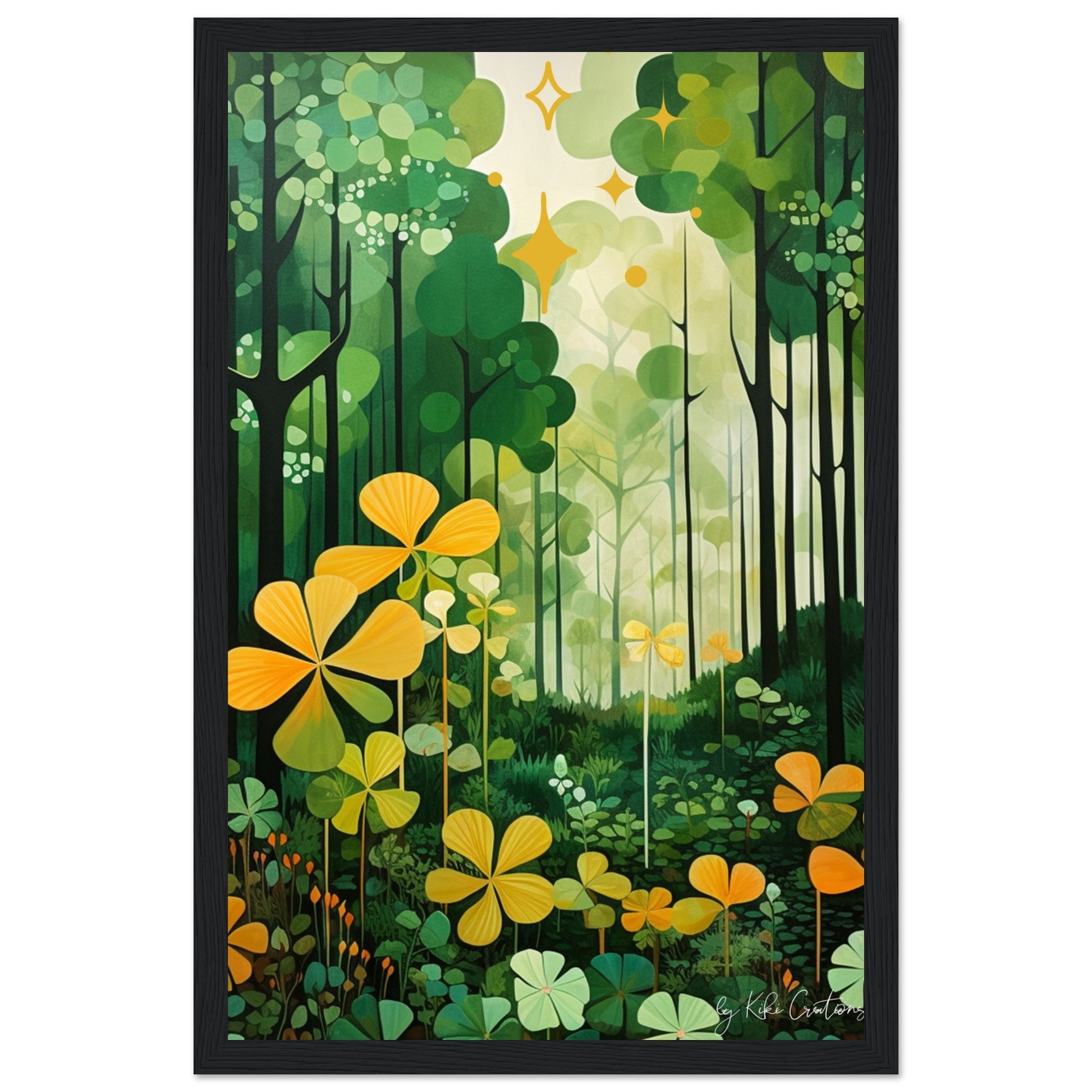Shamrock Whispers: Enchanted Irish Forest: A mesmerizing abstract mid century art piece that immerses viewers in the heart of a lush and mystical Irish forest. The art piece is an ode to the captivating beauty and symbolism of Ireland, "the Emerald Isle", where nature reigns supreme, and the shamrock, a cherished national emblem, becomes an integral part of the landscape.