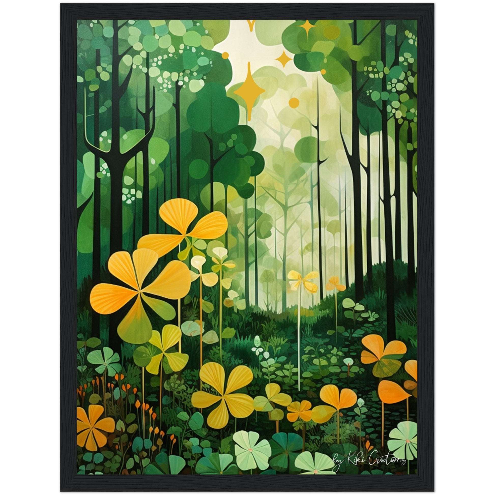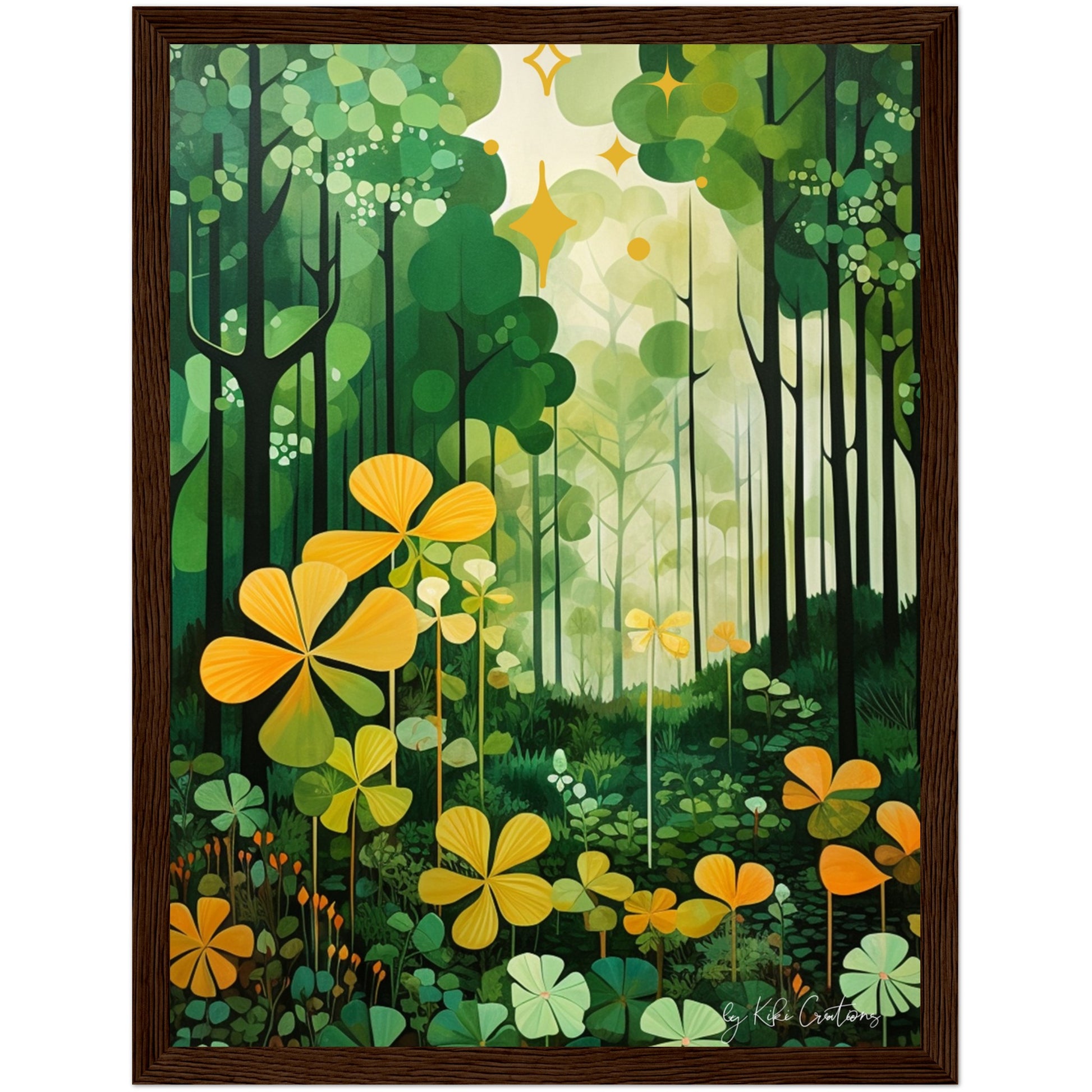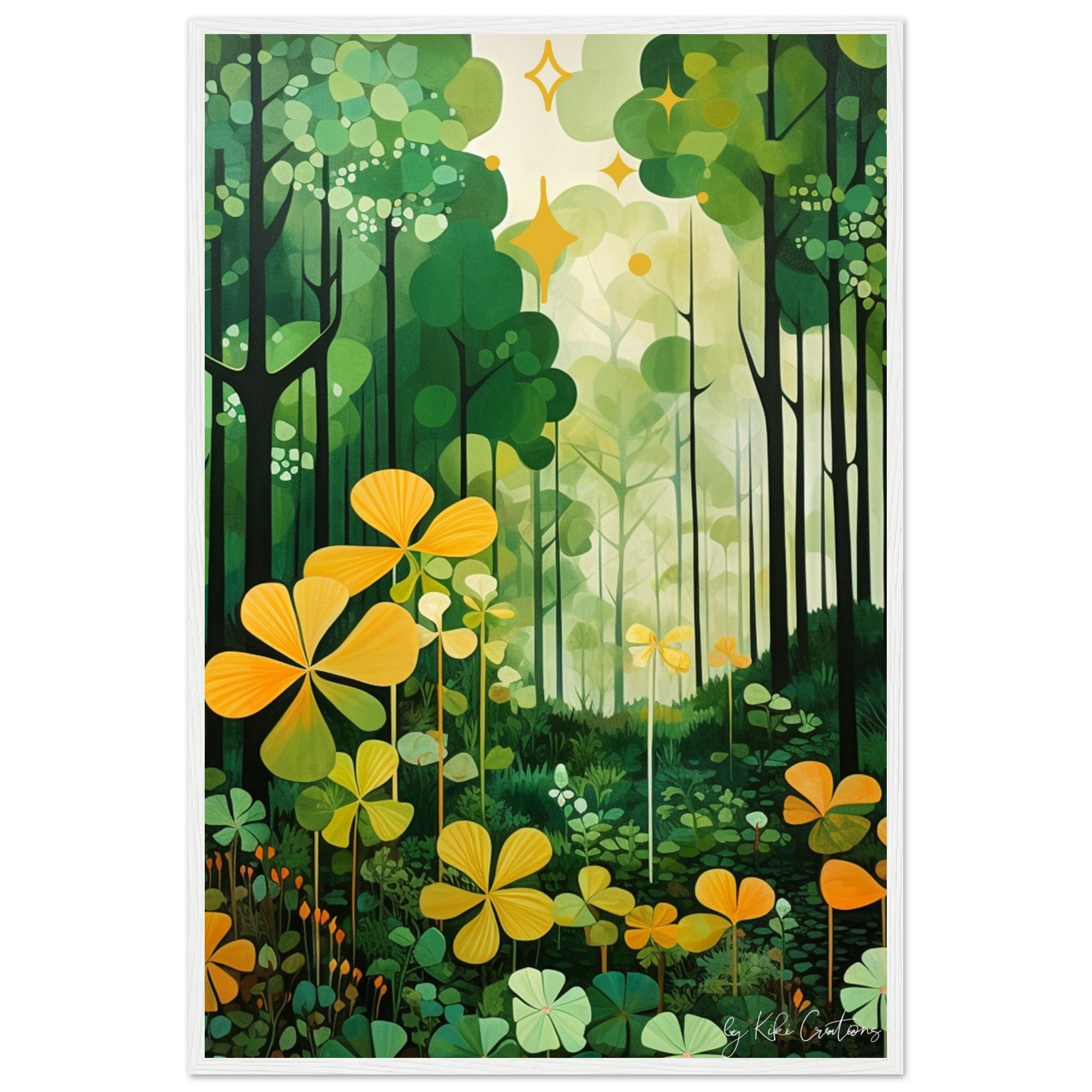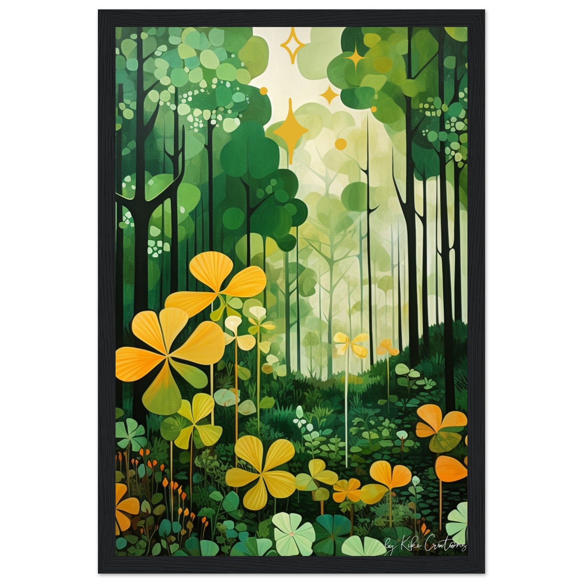 Shamrock Whispers: Enchanted Irish Forest: A mesmerizing abstract mid century art piece that immerses viewers in the heart of a lush and mystical Irish forest. The art piece is an ode to the captivating beauty and symbolism of Ireland, "the Emerald Isle", where nature reigns supreme, and the shamrock, a cherished national emblem, becomes an integral part of the landscape.
