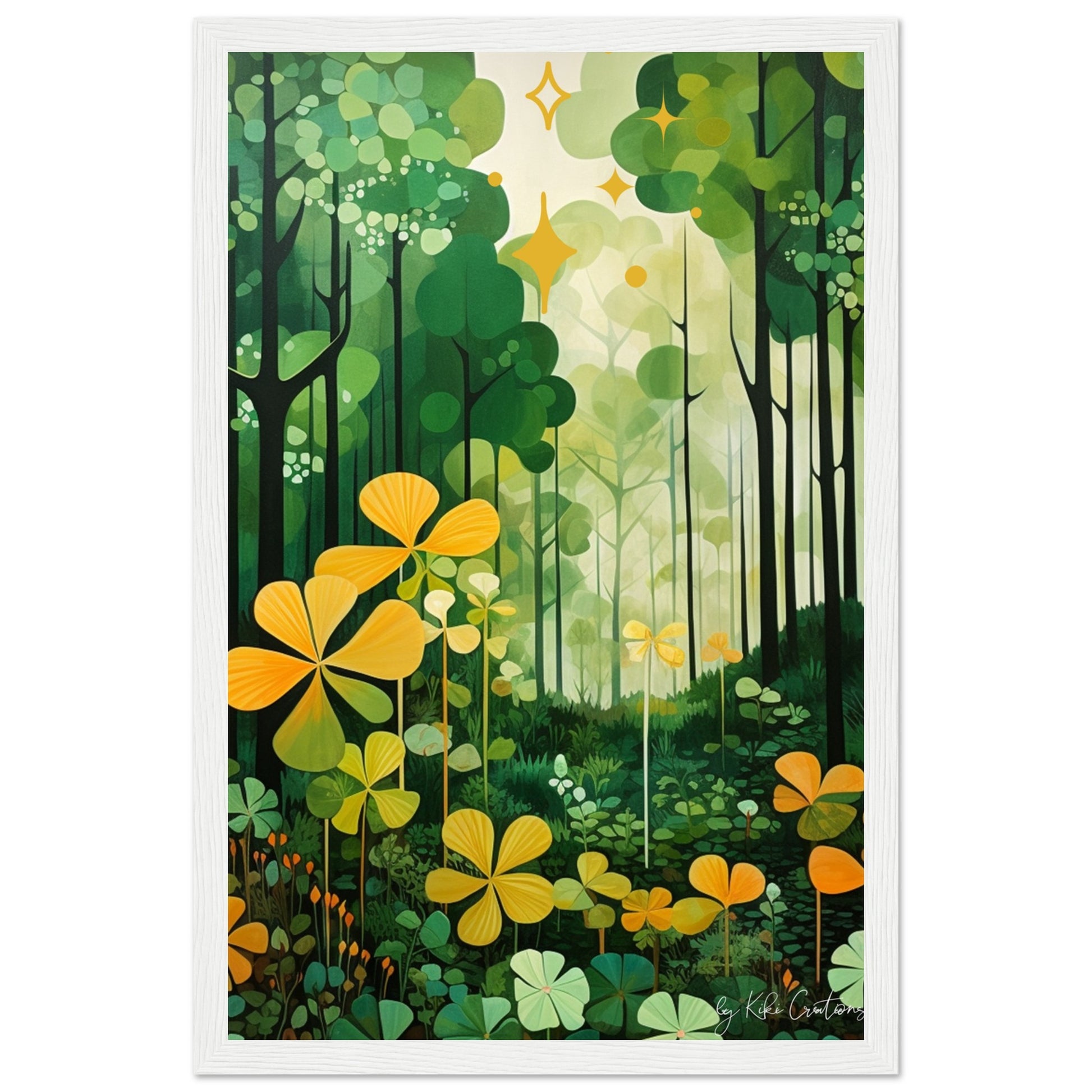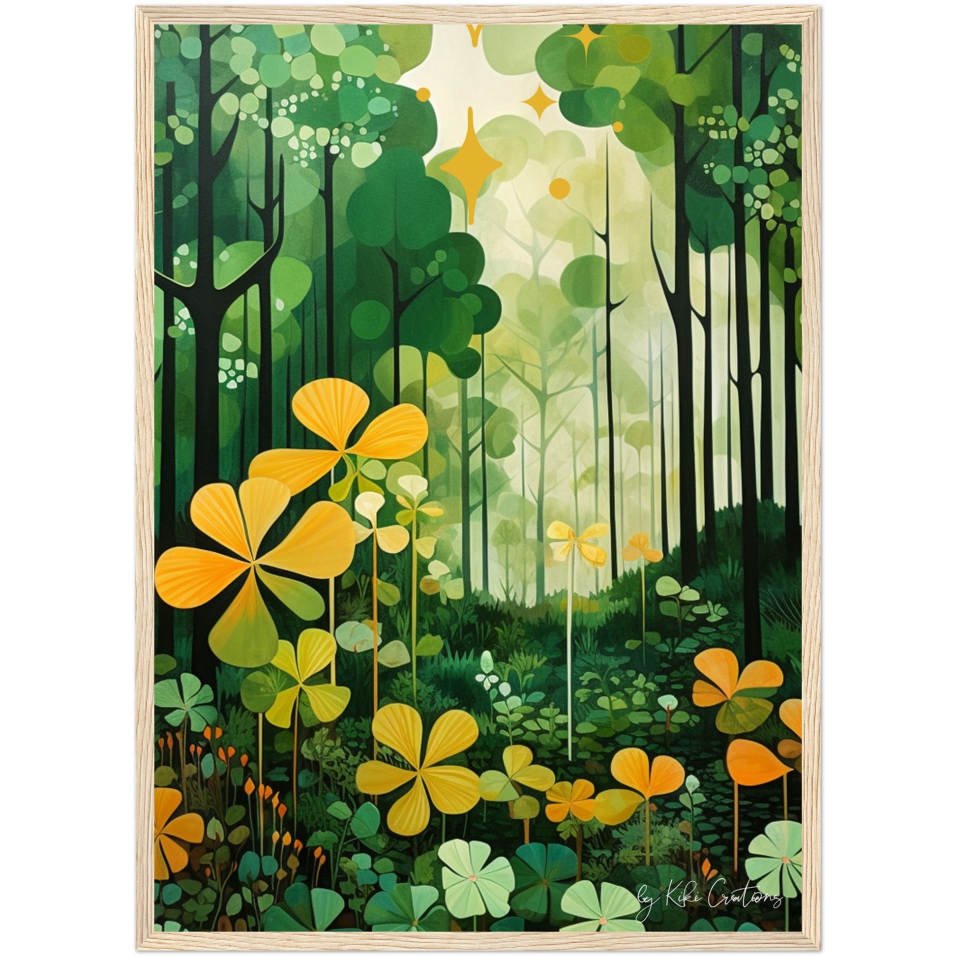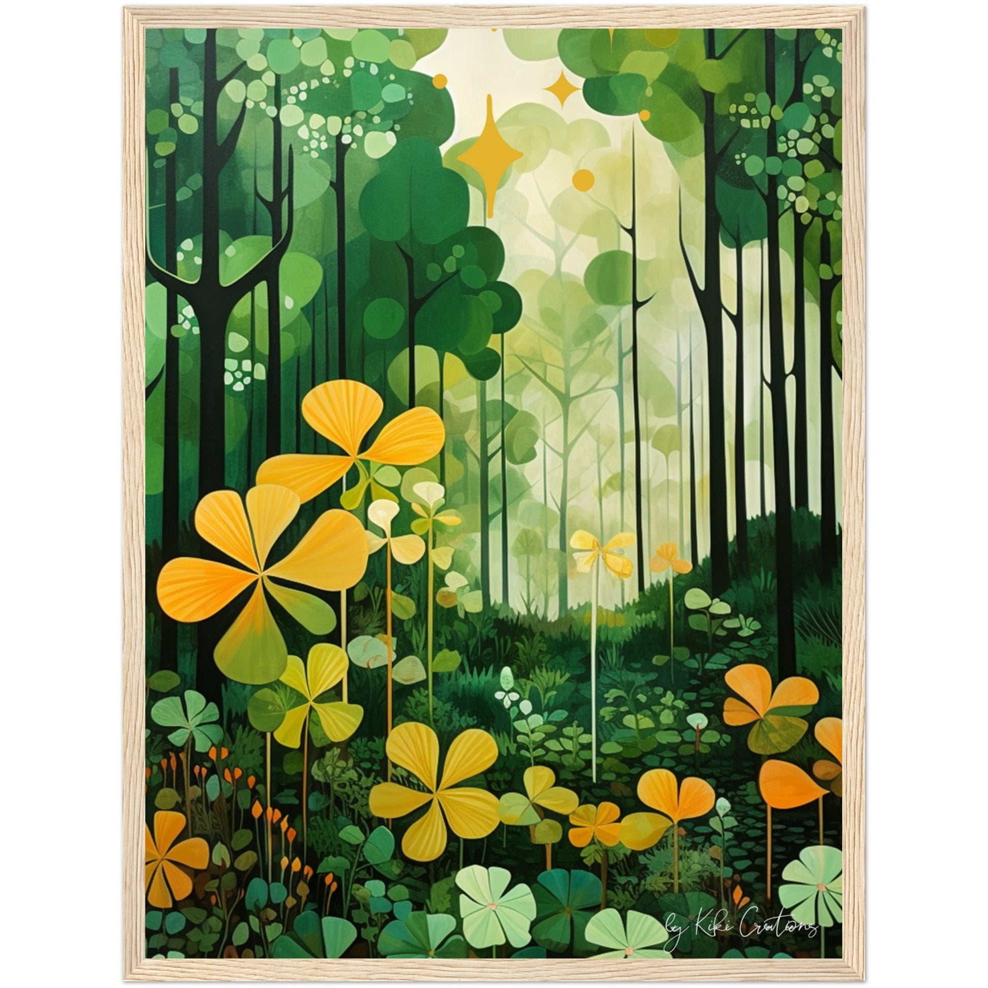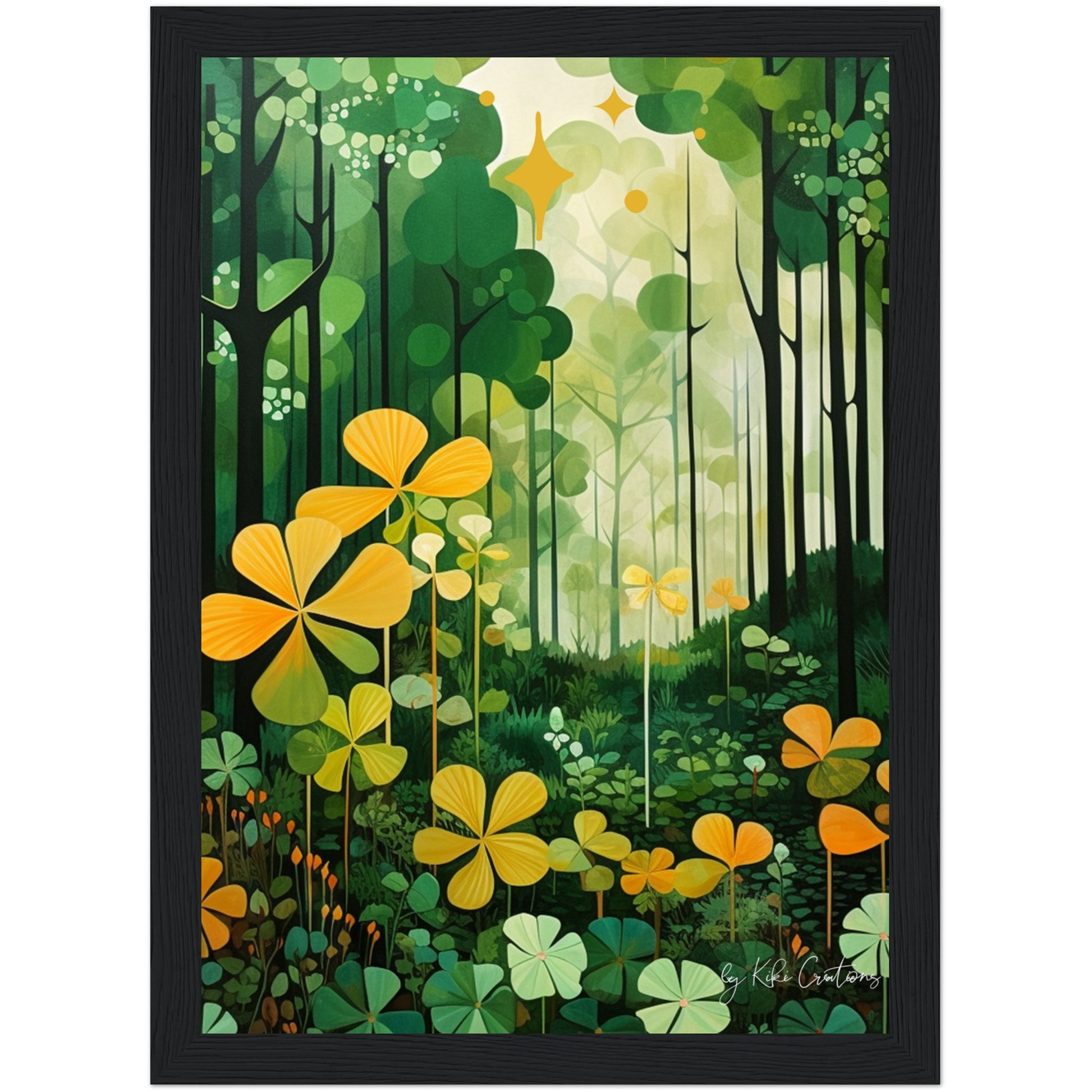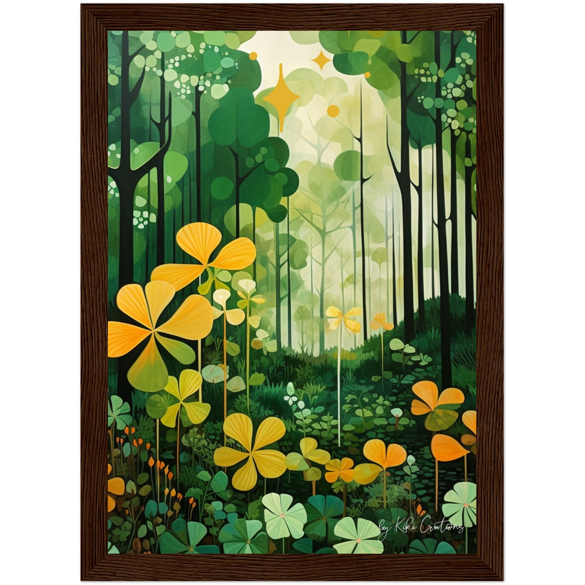 Shamrock Whispers: Enchanted Irish Forest: A mesmerizing abstract mid century art piece that immerses viewers in the heart of a lush and mystical Irish forest. The art piece is an ode to the captivating beauty and symbolism of Ireland, "the Emerald Isle", where nature reigns supreme, and the shamrock, a cherished national emblem, becomes an integral part of the landscape.