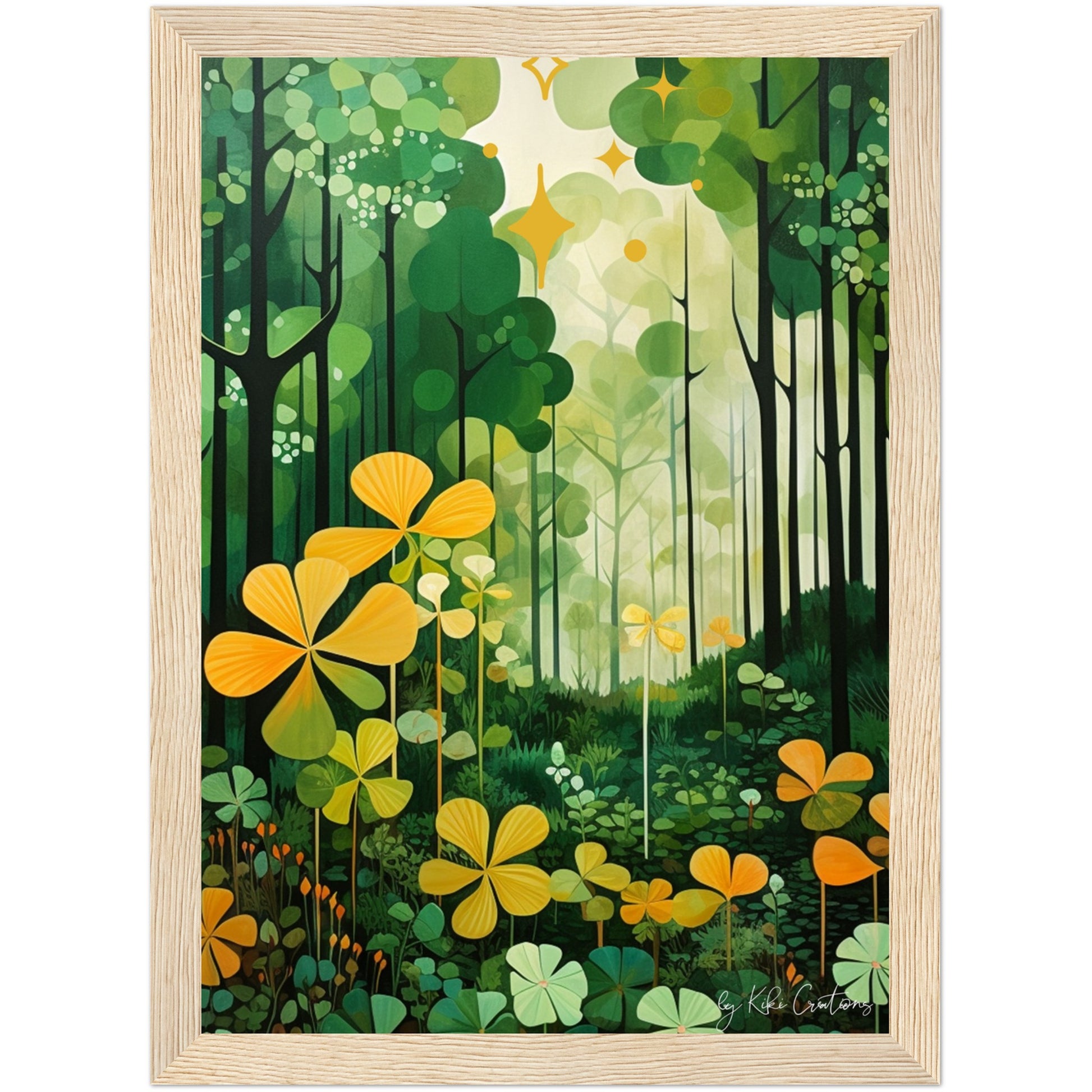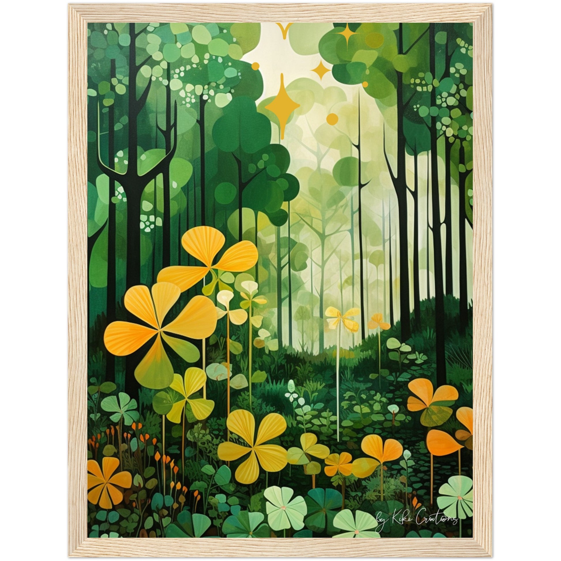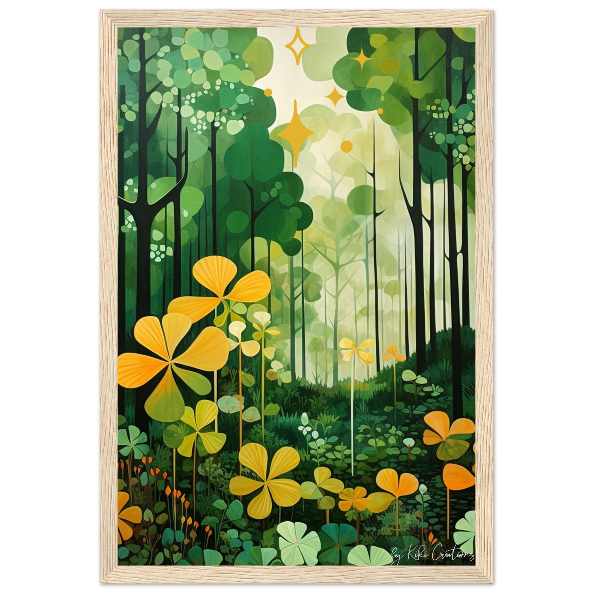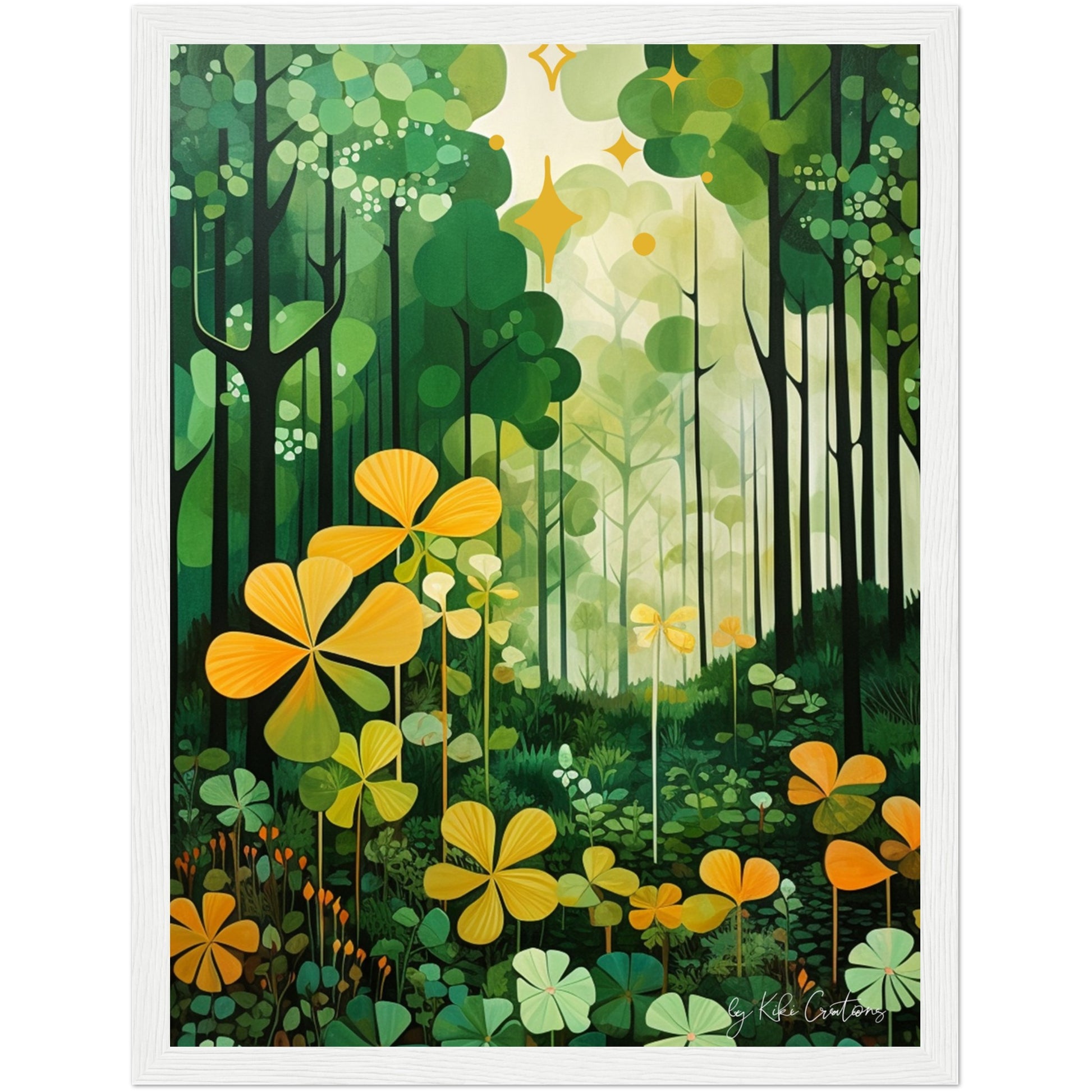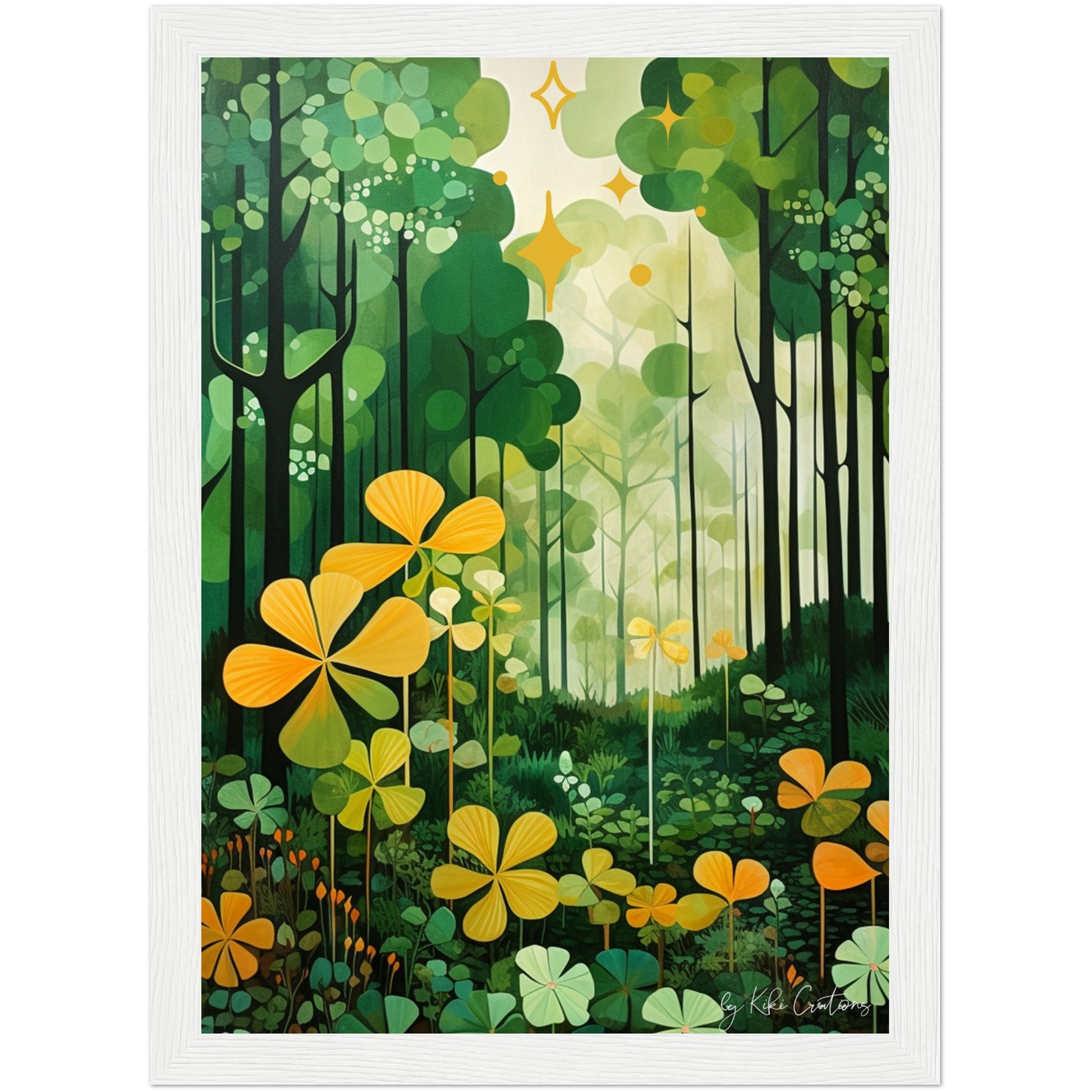 Shamrock Whispers: Enchanted Irish Forest: A mesmerizing abstract mid century art piece that immerses viewers in the heart of a lush and mystical Irish forest. The art piece is an ode to the captivating beauty and symbolism of Ireland, "the Emerald Isle", where nature reigns supreme, and the shamrock, a cherished national emblem, becomes an integral part of the landscape.