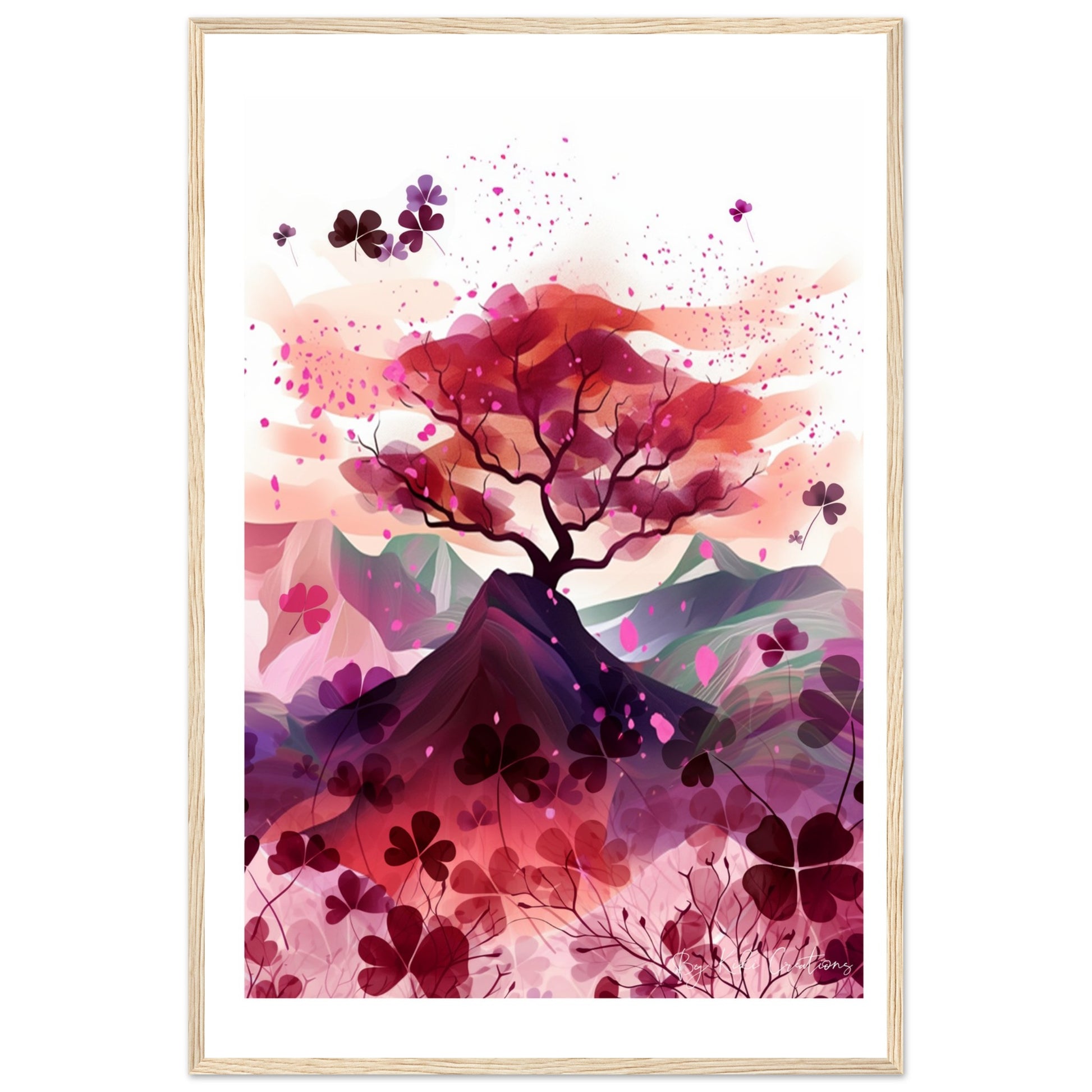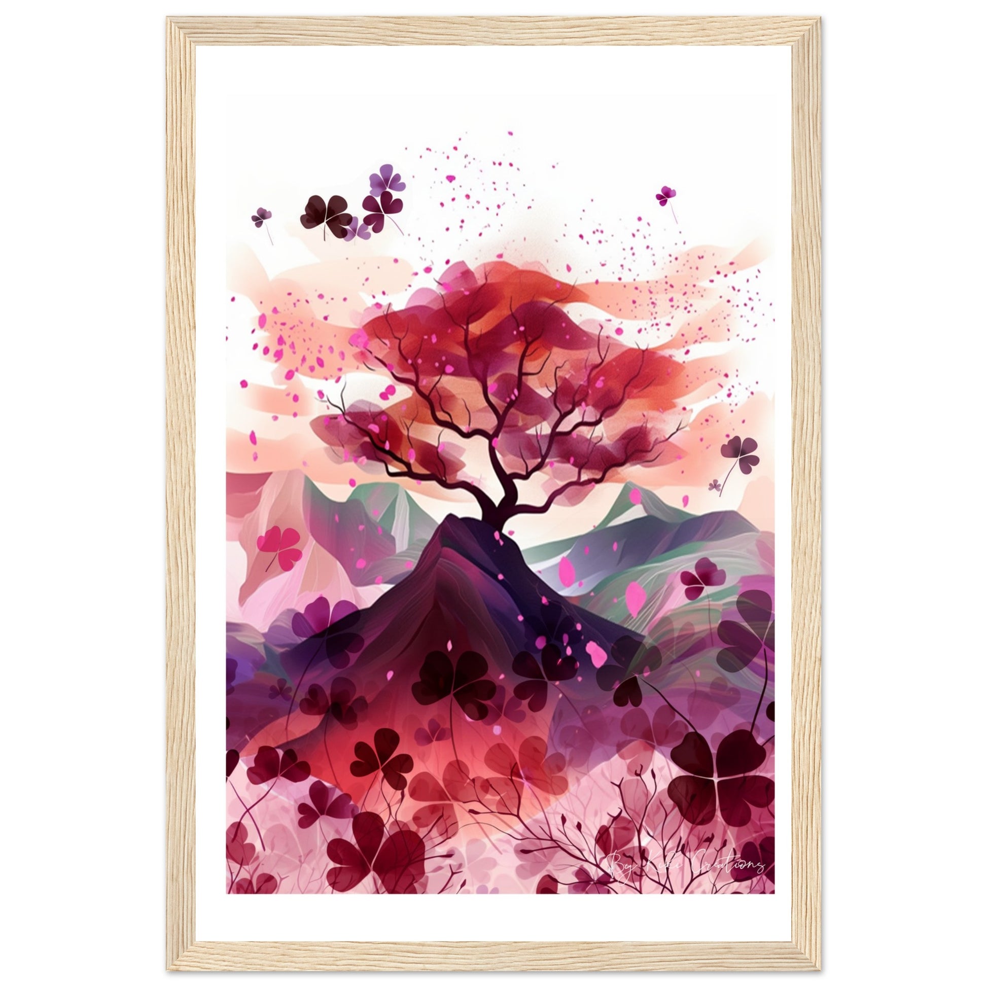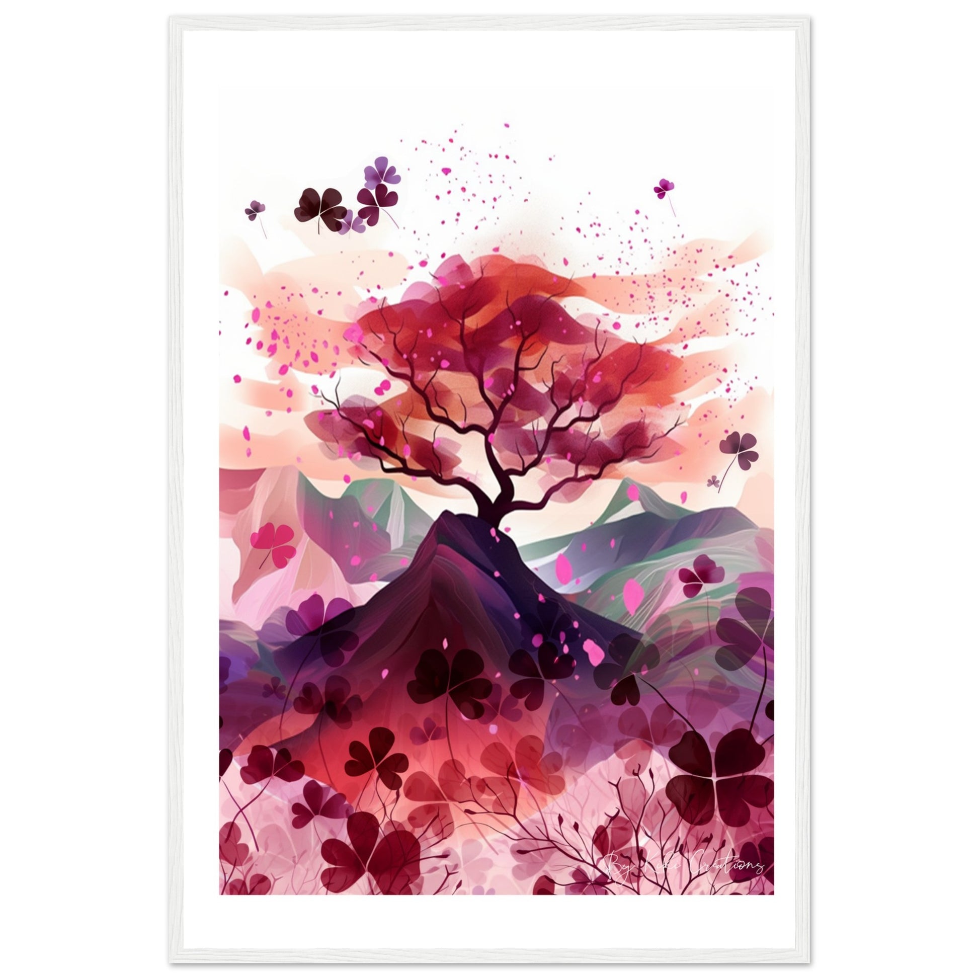 - The centerpiece of the piece is the cherry blossom tree, its delicate pink and white blossoms casting a soft, ethereal glow against the pink and purple shamrock leaves (purposefully and not stereotypical green). The tree's branches stretch gracefully, intertwining with the shamrocks, creating a sense of unity and balance.