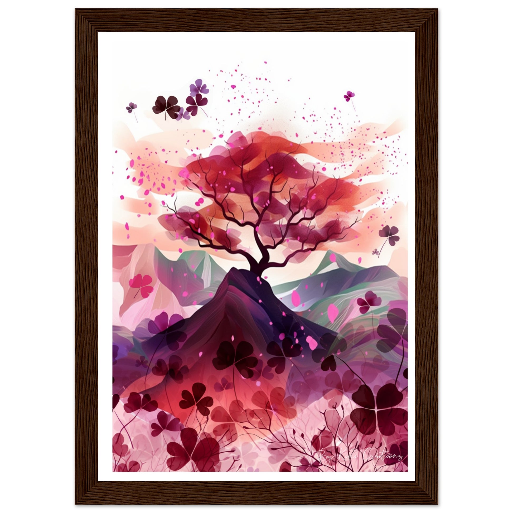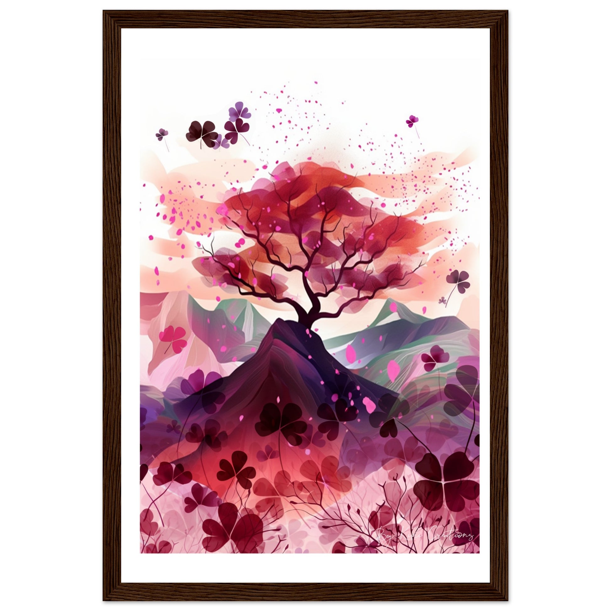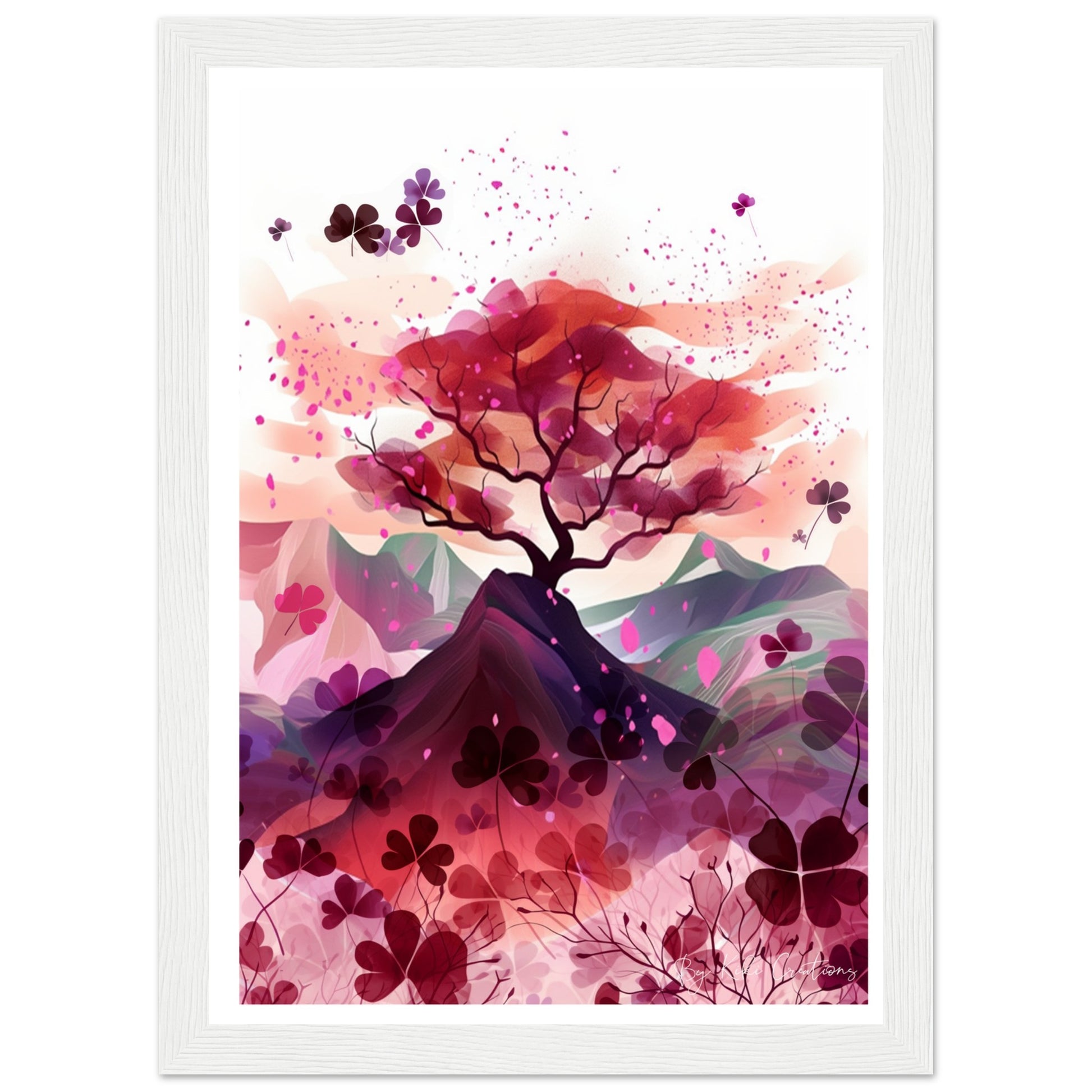 - The centerpiece of the piece is the cherry blossom tree, its delicate pink and white blossoms casting a soft, ethereal glow against the pink and purple shamrock leaves (purposefully and not stereotypical green). The tree's branches stretch gracefully, intertwining with the shamrocks, creating a sense of unity and balance.